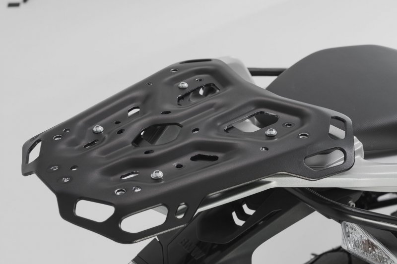 Ready for big adventure: Our ADVENTURE-RACK proves itself with its extreme durability and function-oriented shape. More than 15 years of experience producing racks, combined with feedback from customers and test riders, went into the development of this aluminum rack Material thickness, weight and geometry have been optimized for demanding tours and off-road use. The bike-specific attachments guarantee the best fit and easy mounting on original attachment points. Specifically developed for long-distance enduros, large street and sport touring machines, the ADVENTURE-RACK offers a large contact surface. Numerous, large lashing eyes provide secure hold for tail bags. The functional bores require adapter kits for attaching top cases by SW-MOTECH, Givi, Krauser and Shad or SysBags.