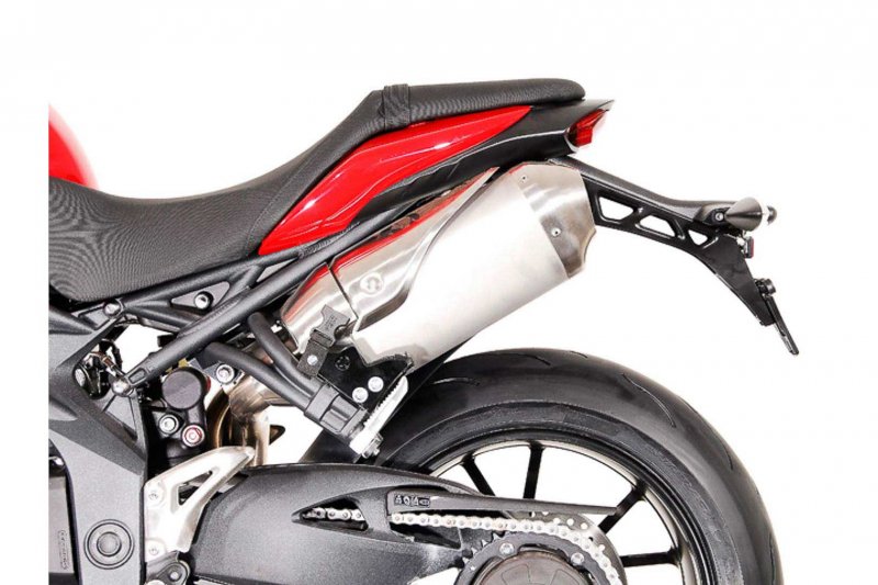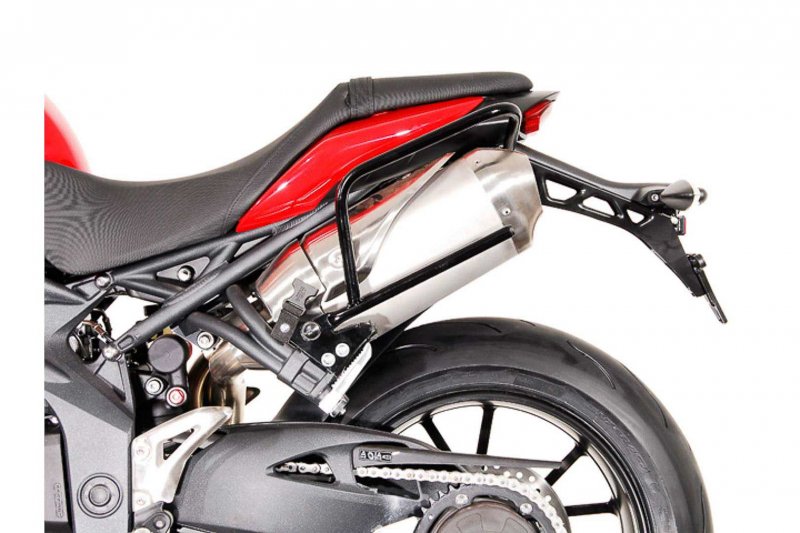 BLAZE offers an innovative way to mount soft saddlebags on sportive motorcycles. The system features mounting arms that quickly attach to the motorcycle and then slip into channels placed on the backside of each bag. These support arms prevent side-to-side movement, stabilize the bags and prevent potential contact with the rear tire or exhaust. The mounting arms detach quickly to retain the look of the motorcycle when the bags are removed.