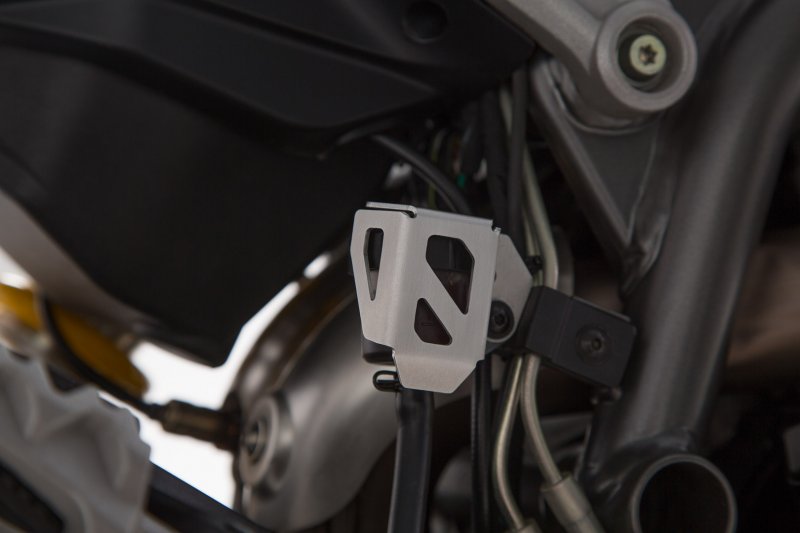 The compact brake reservoir guard protects the original brake reservoir from rock chips and simultaneously prevents unwanted removal of the cover. The protector can be installed on the motorcycle in a few simple steps.