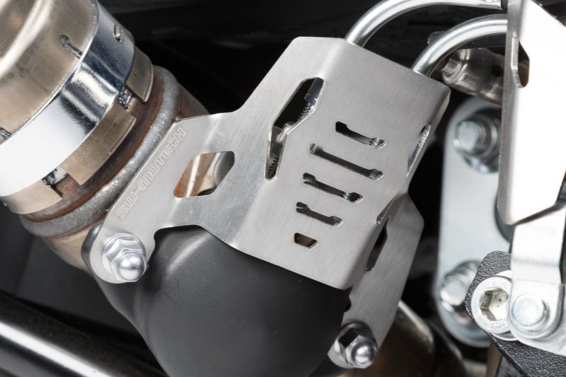 The compact exhaust valve guard made of brushed aluminum protects the motorcycle's original air vane from stone chips and boot contact. The protector can be installed on the motorcycle in a few simple steps.