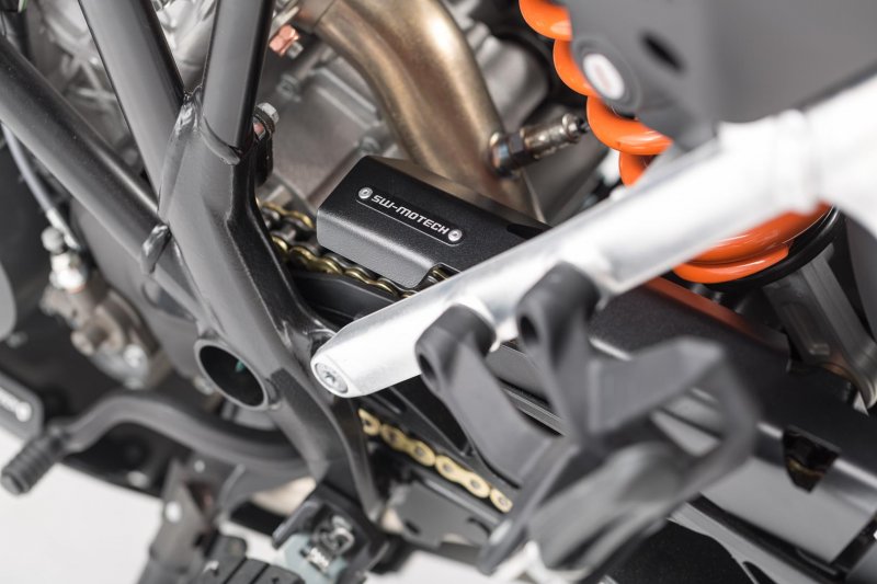 As a high-quality supplement to the original chain guard, this guard made of high-strength aluminum alloy covers the otherwise exposed chain section between the driver and passenger footrests. The sturdy protective element reliably prevents contact between the boot and chain and avoids high-levels of chain oil or grease spray.