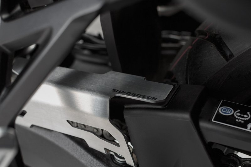 As a high-quality supplement to the original chain guard, this guard made of high-strength aluminum alloy covers the otherwise exposed chain section between the driver and passenger footrests. The sturdy protective element reliably prevents contact between the boot and chain and avoids high-levels of chain oil or grease spray.