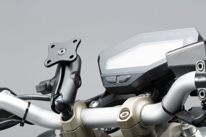 The 1" ball of the GPS mount is attached to the motorcycle by a bolt that simply replaces the original one. The pivoted socket arm enables optimal positioning of the GPS device. The GPS holder with its universal drill-hole pattern allows the secure attachment of many current models of GPS devices such as Navi Case Pro device cases and smartphone hardcases from SW-MOTECH.