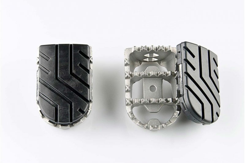 Our reasonably priced ION footrest kits allow the footrest to be mounted at its original height or lowered by 15 mm. Extremely durable and built to last, these stainless-steel footrests provide plenty of extra grip and are recommended for adventure, offroad and urban motorcycles. Hinges made from high-strength aluminum alloy ensure that the footrest can fold out of the way if the bike tips over. The removable rubber top surface reduces vibration, and the profile gives you a firm grip during offroad riding. To mount the bike-specific hinge adapter to the footrest sockets, the original attachments (springs, bolts, etc.) are used.
