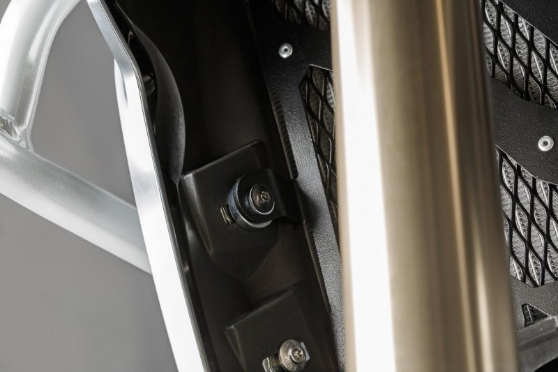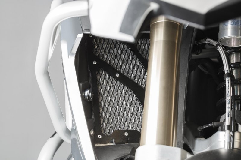 The protector, constructed to fit with the peg length of the motorcycle, offers an extra dose of protection from rock chips. The sturdy construction consists of an aluminium alloy frame and a grid that keeps out kicked-up rocks without blocking airflow to the radiator. The radiator guard can be quickly and easily mounted on original attachment points. All elements necessary for installation are included in delivery.