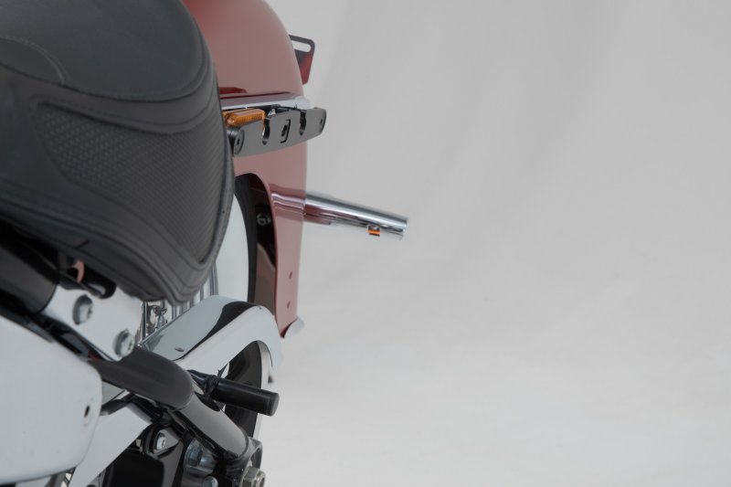 The bike-specific bag carrier can be easily and quickly mounted on to original attachment points on the fender strut. The quick lock system allows LH Legend Gear side bags to be attached and removed in just a few easy hand movements, without the driver foregoing reliable bag fastening.