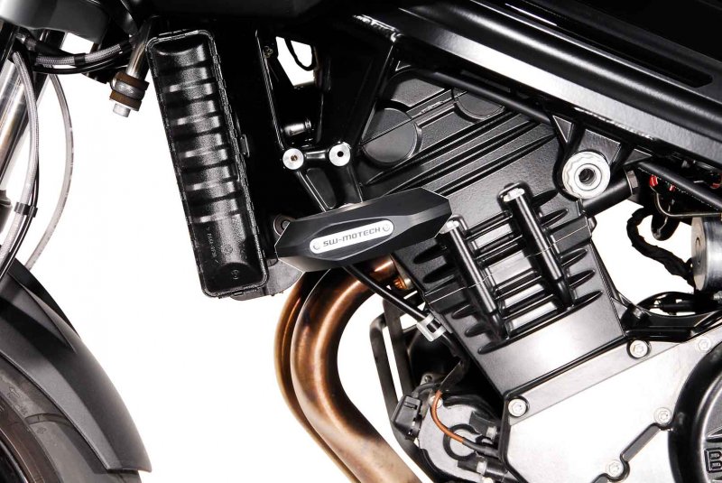 Frame crash pads provide additional protection in the event of a fall. The shape, surface and material of the pads provide excellent sliding properties to reduce damage to the motorcycle. The robust aluminium mounting bracket is easy to install, and the abrasion-resistant, CNC-milled slider pads are replaceable.
