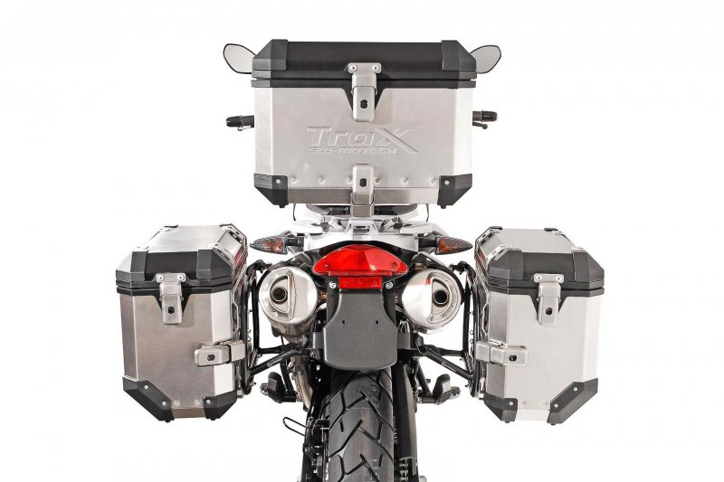 TRAX ION Aluminum case systemOrder, unpack, mount and drive away. The TRAX ION aluminum case system contains everything needed to mount two side cases on your motorcycle: two TRAX ION side cases, two removable SW-MOTECH side carriers, anti-theft protection, matching locks, adapter kit and accessories. The bike-specific carriers and the size of the cases are perfectly matched to the rear shape and exhaust system of the motorcycle. Robust processing with a body made of 1.5 mm-thick aluminum, reinforced with sturdy plastic elements and yet still lightweight: The TRAX ION cases are waterproof thanks to robot-assisted welding, punch rivet technology and interchangeable cover gaskets. The companion for trips and adventures of all types wins you over with its large chamfer for best cornering clearance, sleek look and a large range of accessories - all at an attractive price. EVO Side carrier- Detachable carrier for use with almost all common case systems