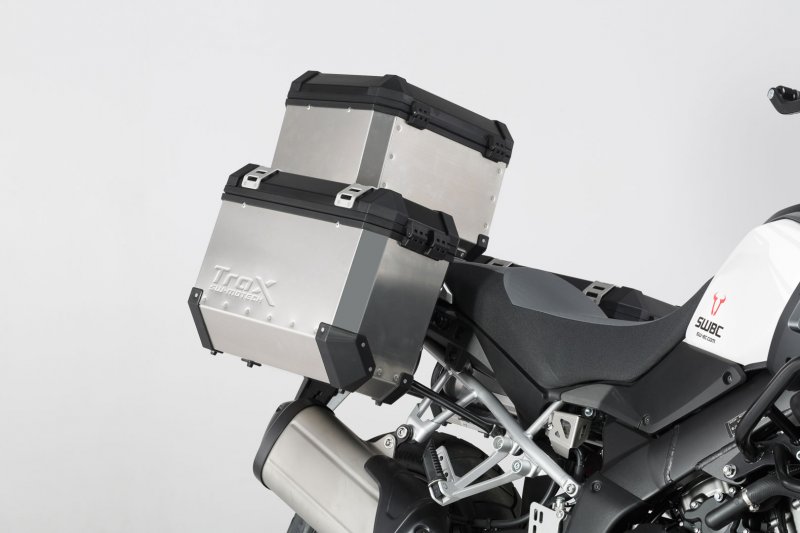 Order, unpack, mount and drive away. The TRAX ION aluminum case system contains everything needed to mount two side cases on your motorcycle: two TRAX ION side cases, two removable SW-MOTECH side carriers, anti-theft protection, matching locks, adapter kit and accessories. The bike-specific carriers and the size of the cases are perfectly matched to the rear shape and exhaust system of the motorcycle. Robust processing with a body made of 1.5 mm-thick aluminum, reinforced with sturdy plastic elements and yet still lightweight: TRAX ION motorcycle cases are the new generation from the popular TRAX EVO series. The aluminum case was completely redesigned - the TRAX ION are waterproof thanks to robot-assisted welding, punch rivet technology and interchangeable cover gaskets. The companion for trips and adventures of all types wins you over with its large chamfer for best cornering clearance, sleek look and a large range of accessories - all at an attractive price.