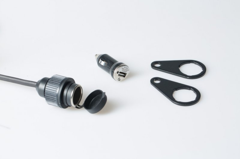 The cigarette lighter outlet of the universal electronics kit connects directly to the bike's power system. You can charge your smartphone or GPS device using the included USB adapter. The mounting bracket can be attached to virtually any handlebar using the M8 and M10 screws included in the kit. Alternatively, you can install the power socket on your bike's fairing.
