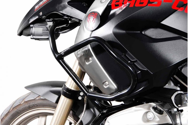 The upper crash bars are constructed of black, powder-coated steel and are mounted as a supplement to the crash bar by SW-MOTECH.