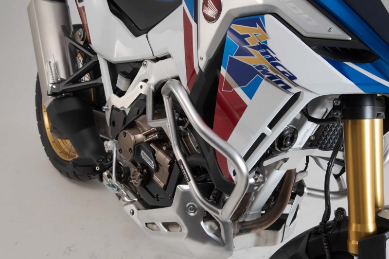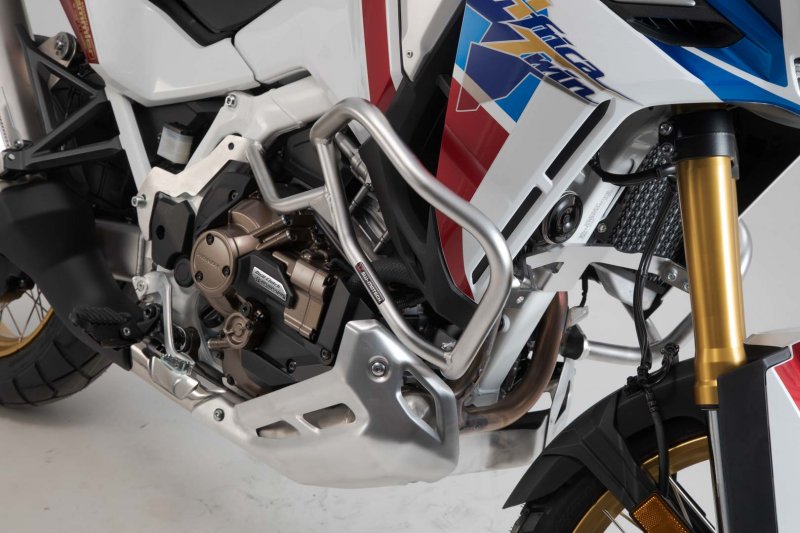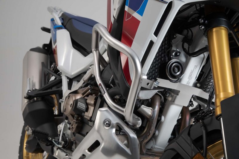 The sturdy stainless steel crash bar for the Honda Africa Twin CRF1100L Adventure Sports protects both the engine and components from damage due to falls and scratches. The use of blasted and electropolished stainless steel offers an advantage over coated steel in that damage to the crash bar cannot lead to a loss in corrosion resistance.