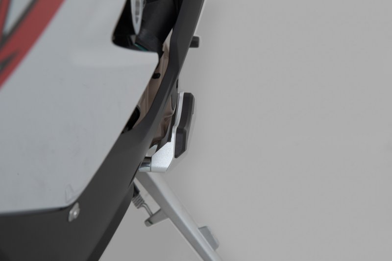 Protector set machined of high strength aluminium alloy for right and left engine case cover. The elegant construction protects exposed case parts from ground contact and in a fall, effectively protects from greater damage. The protectors are made of black anodized light metal, on the left side an interchangable, silver anodized wear part is attached for additional reinforcement.