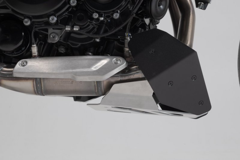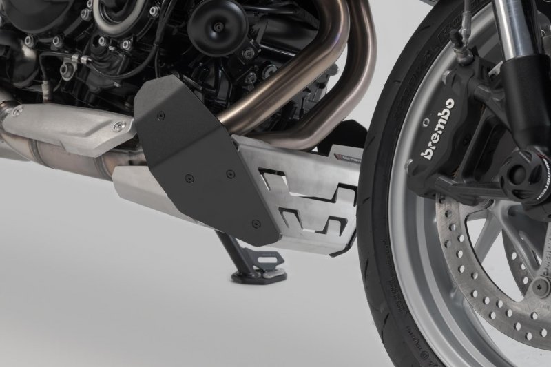 The SW-MOTECH front spoiler, which is tailored to the design of the bike, offers reliable protection against stone chips and unintentional contact with the ground. The powder coating on the surface is extremely durable and permanently protects against corrosion. Extremely sturdy underbody protection can be easily attached to original attachment points using the custom steel attachments provided, all without drilling or welding.
