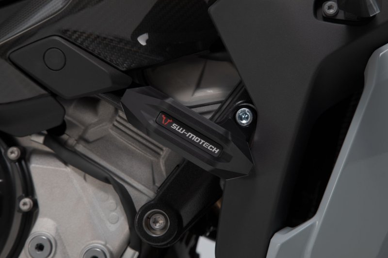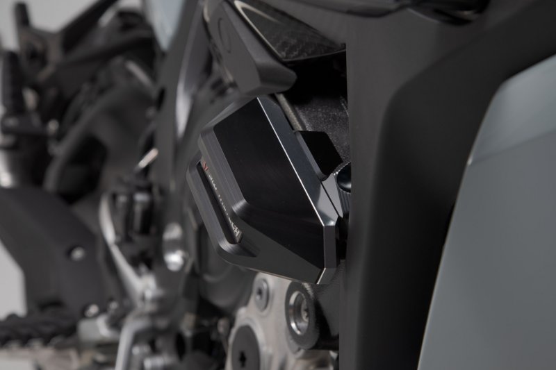 Frame crash pads provide additional protection in the event of a fall. The shape, surface and material of the pads provide excellent sliding properties to reduce damage to the motorcycle. The robust aluminium mounting bracket is easy to install, and the abrasion-resistant, CNC-milled slider pads are replaceable.