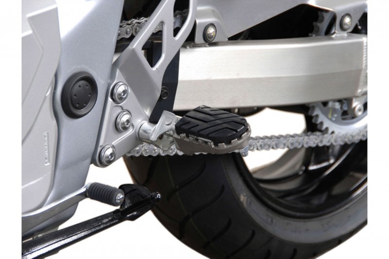 Our reasonably priced ION footrest kits allow the footrest to be mounted at its original height or lowered by 15 mm. Extremely durable and built to last, these stainless-steel footrests provide plenty of extra grip and are recommended for adventure, offroad and urban motorcycles. Hinges made from high-strength aluminum alloy ensure that the footrest can fold out of the way if the bike tips over. The removable rubber top surface reduces vibration, and the profile gives you a firm grip during offroad riding. To mount the bike-specific hinge adapter to the footrest sockets, the original attachments (springs, bolts, etc.) are used. Bike-specific Vehicle Type Approval for use on German roads is available.